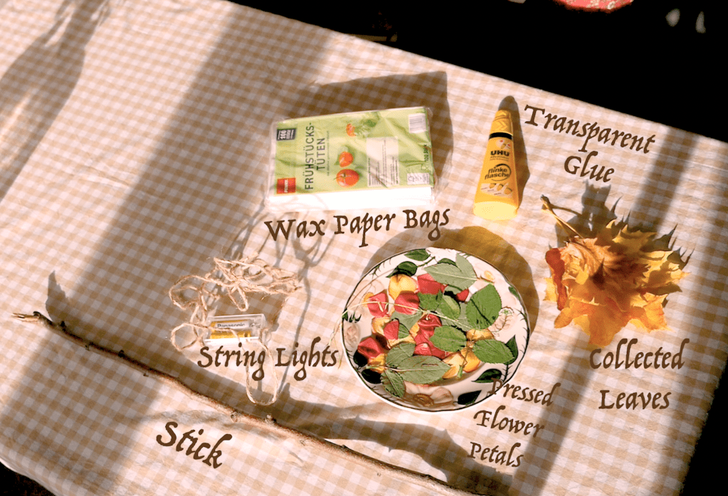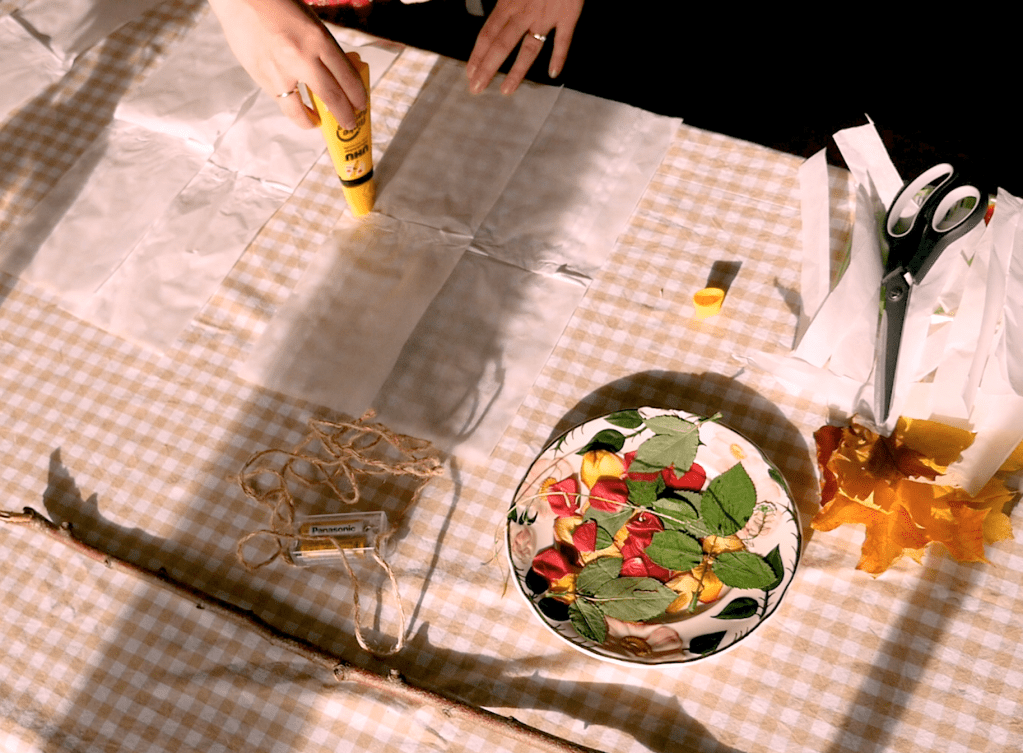 I first started by cutting the paper bags in half and glueing them together to make one long strip that I would later fold in half. I’m not sure exactly how long it was but maybe around a meter, give or take. I then applied a light layer of glue to the whole surface and got to work decoratively placing my petals and collected leaves. When I liked what I hat made folded the long strip of wax paper in half, glue sides together and pressed down. I then glued both of the edges together to create a round circular shape. From there, I gently placed the lantern on the piece of cardboard and had Nik hold it in place (it was a bit wobbly at this point) while I traced around the circle on the cardboard. We then cut that circle out of the cardboard, then cut a slit and cut a smaller circle out of that circle (to make a kind of ring). Lastly poke or punch 3 evenly spaced hole in the ring. Glue the cardboard circle inside the top of the lantern. This stabilised the cylinder.